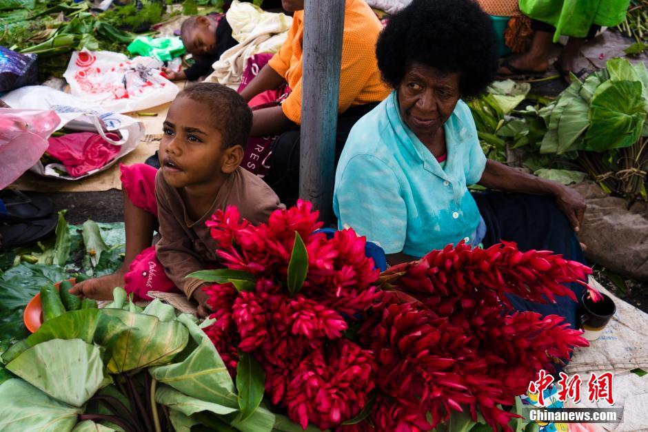 一位妇人带着自己的孙子在苏瓦市菜市场卖花和芋头叶(芋头叶是斐济人的日常蔬菜)。每周三周六,苏瓦郊区以及周边城市的农民会带上自家未上学的子女来到这里售卖农产品。祝莉摄