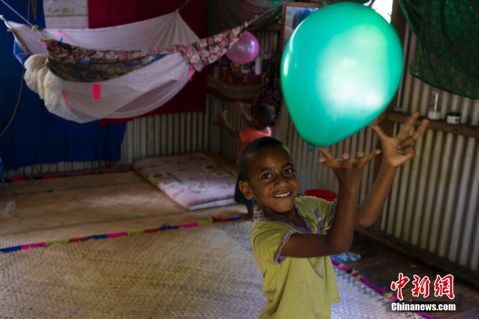 而在乡村,孩子们的玩具和住所就相当简单了,图为一个男孩在自家屋里玩气球,气球为一名韩国牧师所赠。祝莉 摄
