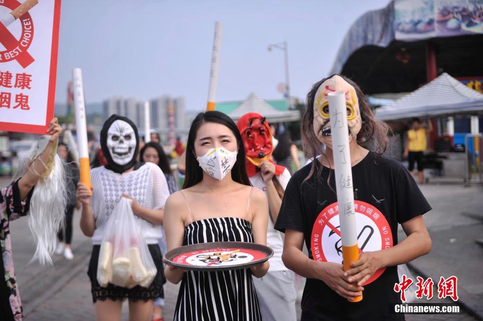 5月30日,重庆洋人街工作人员举着灭烟托盘,戴着面具举起巨型“卷烟”,以行为艺术的形式在景区内倡导游客禁烟,迎接“世界无烟日”的到来。中新社记者陈超 摄