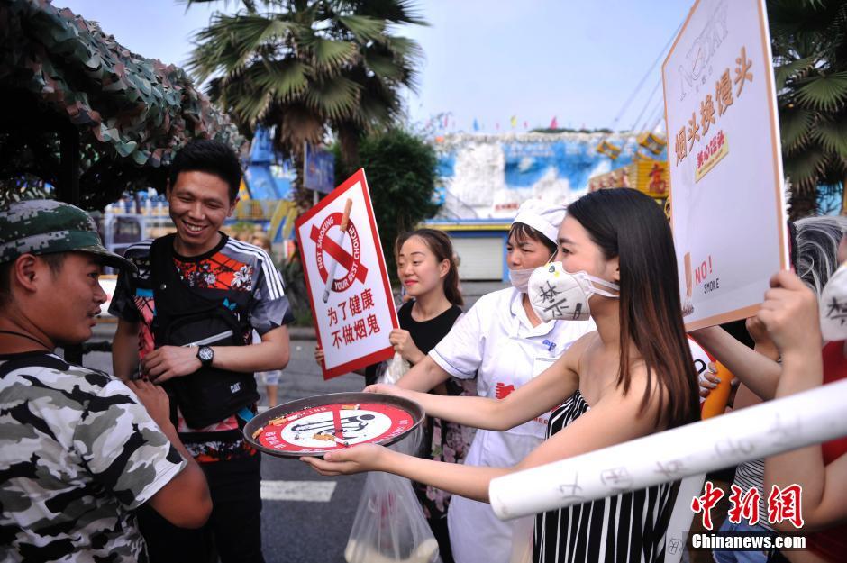 5月30日,重庆洋人街工作人员举着灭烟托盘,戴着面具举起巨型“卷烟”,以行为艺术的形式在景区内倡导游客禁烟,迎接“世界无烟日”的到来。图为工作人员举着灭烟托盘要求游客灭掉手中烟。中新社记者陈超 摄