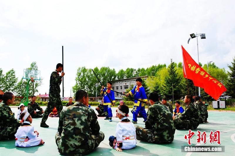 5月30日,在“六一”儿童节到来之际,武警黑龙江边防总队佳木斯支队同江机动大队热闹非凡,这个中队组织开展的“警营开放日”活动吸引了驻地学校的赫哲族孩子们走进边防警营,在边防官兵叔叔们的陪伴下,度过了一个难忘的儿童节。图为边防官兵为赫哲族儿童演示警棍战术。中新社记者 于琨 摄