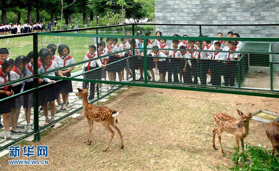 朝中社6月7日提供的照片显示,朝鲜青少年在首期夏令营中参观梅花鹿。图片来源:新华网