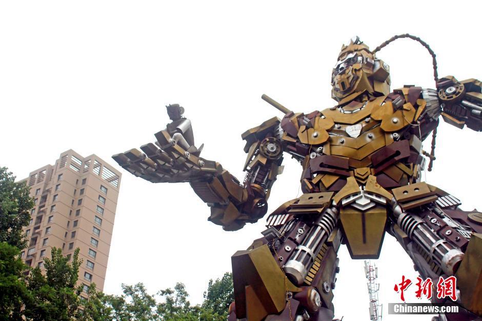 6月23日,辽宁沈阳,几层楼高的“变形金刚版”齐天大圣孙悟空现身市区街头。该巨型机器孙大圣一手背在身后持金箍棒,一手掌中托起猴子猴孙,头上的金属“雉鸡翎”气势威武。中新社记者 孙昊声 摄