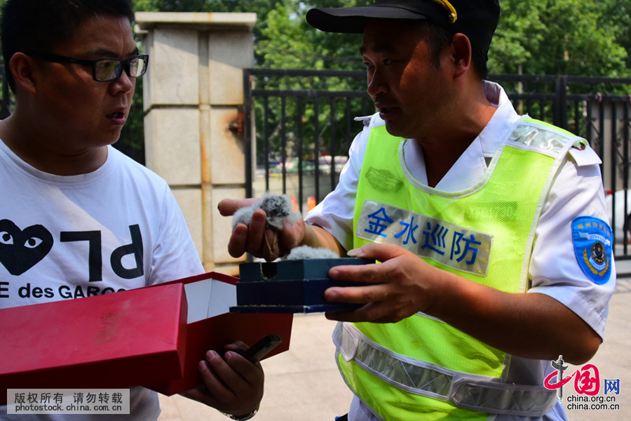 2016年6月22日上午,郑州的哥郭俊升将四天前雨后救下的4只鸺(xiū)鹠(liú)雏鸟,也就是俗称的小猫头鹰,交给郑州市林业局野生动物救护站。鸺(xiū)鹠(liú)是益鸟,主要以老鼠为食,是国家重点二级保护动物。中国网图片库 李四信摄