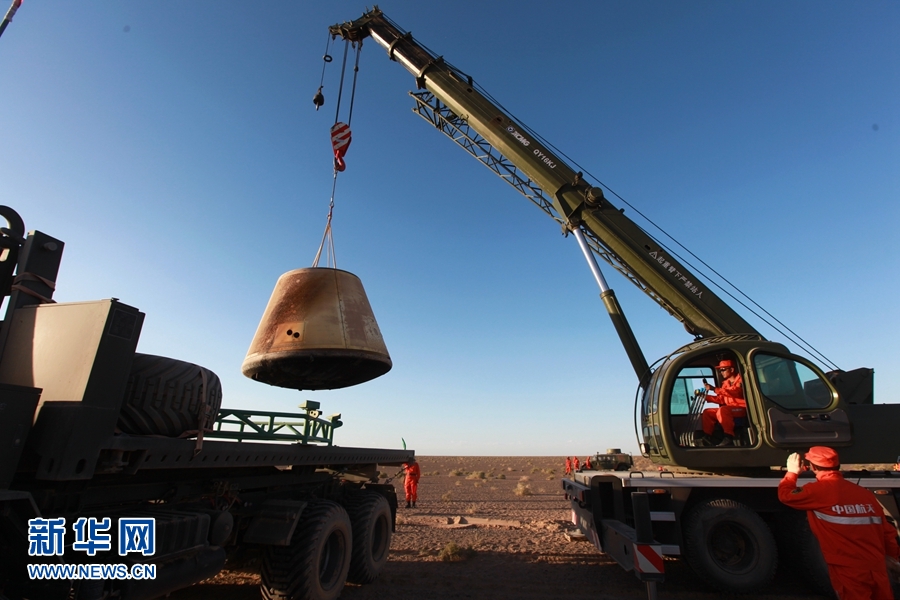 6月26日23时,长征七号运载火箭搭载的多用途飞船缩比返回舱已经检查回收完毕,安全转运至酒泉卫星发射中心。这是地面搜救分队正在调运返回舱。新华社记者琚振华 摄