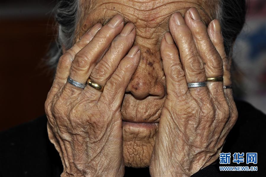 山西省武乡县故城镇羊公岭村郝月莲老人在回忆那段屈辱的历史(2016年3月7日摄)。