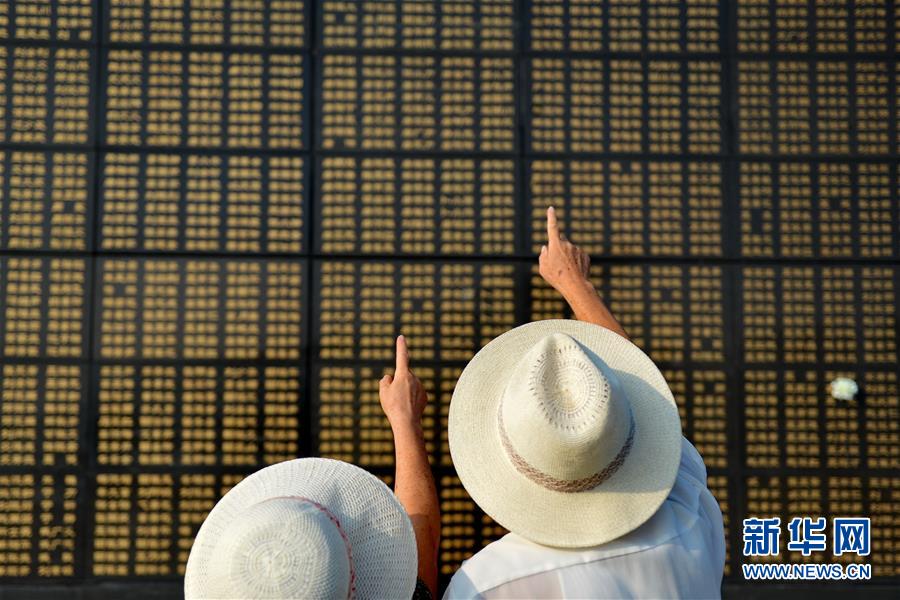 7月26日,在唐山大地震纪念墙前,一对夫妇在寻找亲人的名字。唐山大地震40周年纪念日前夕,河北唐山市民来到唐山地震遗址纪念公园,在刻有24万罹难者姓名的纪念墙前献上鲜花,悼念逝去的亲人。新华社记者牟宇 摄