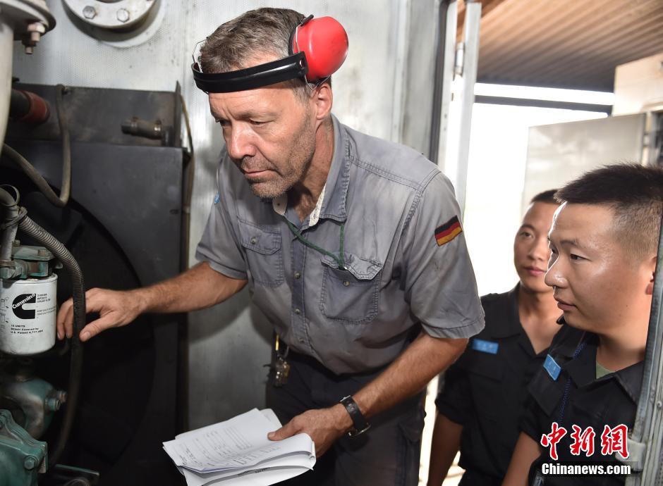 联合国核查官沃巴伦·诺伯特(Wallbarum·Norbert)(左一)正在对中国第四支驻利比里亚维和警察防暴队发电机组进行核查。李金良 摄