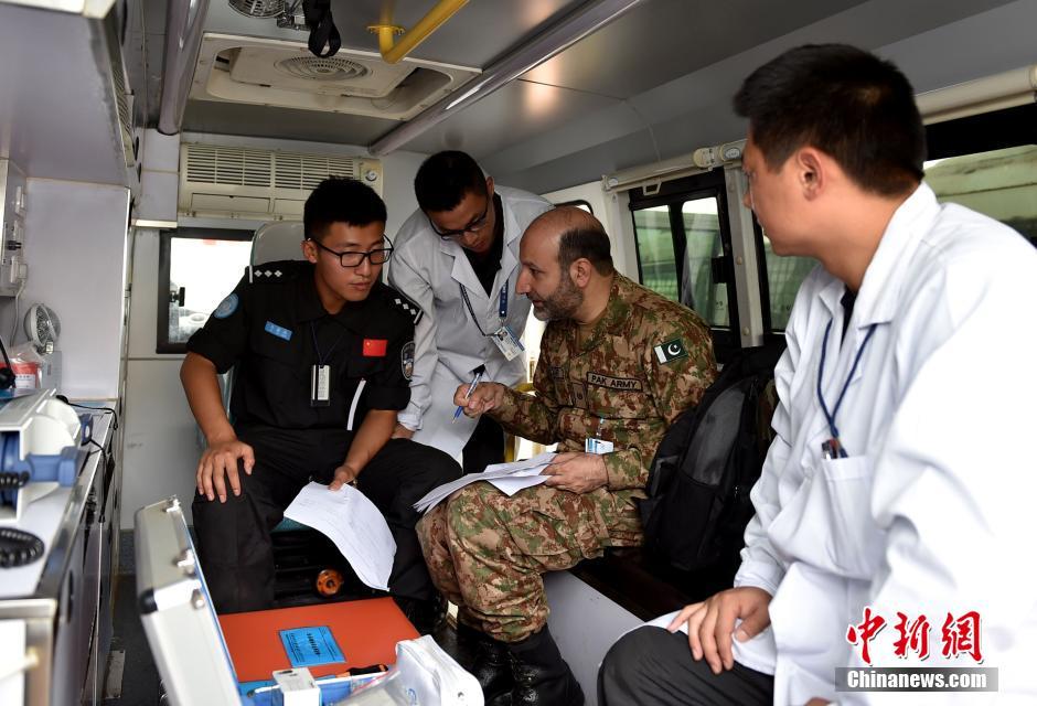 联合国核查官瓦卡·艾力·卡哈(Waqar·Ali·Khan)(左三)正在对中国第四支驻利比里亚维和警察防暴队救护车状况进行核查。李金良 摄