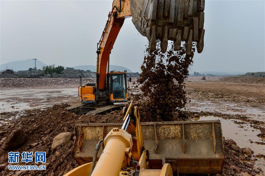 8月6日,多台大型机械在河北省沙河市册井村疏浚河道,加固堤坝。