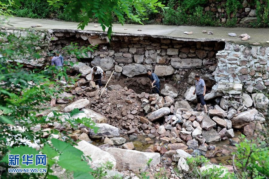 8月6日,河北省沙河市柴关乡阴河沟村村民在垒筑被洪水冲毁的道路。新华社记者 牟宇 摄