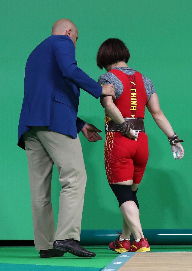 8月10日,向艳梅(右)在第三次挺举失败后离场。当日,在2016年里约奥运会女子举重69公斤级决赛中,中国选手向艳梅以261公斤的总成绩夺得冠军。新华社记者李明摄