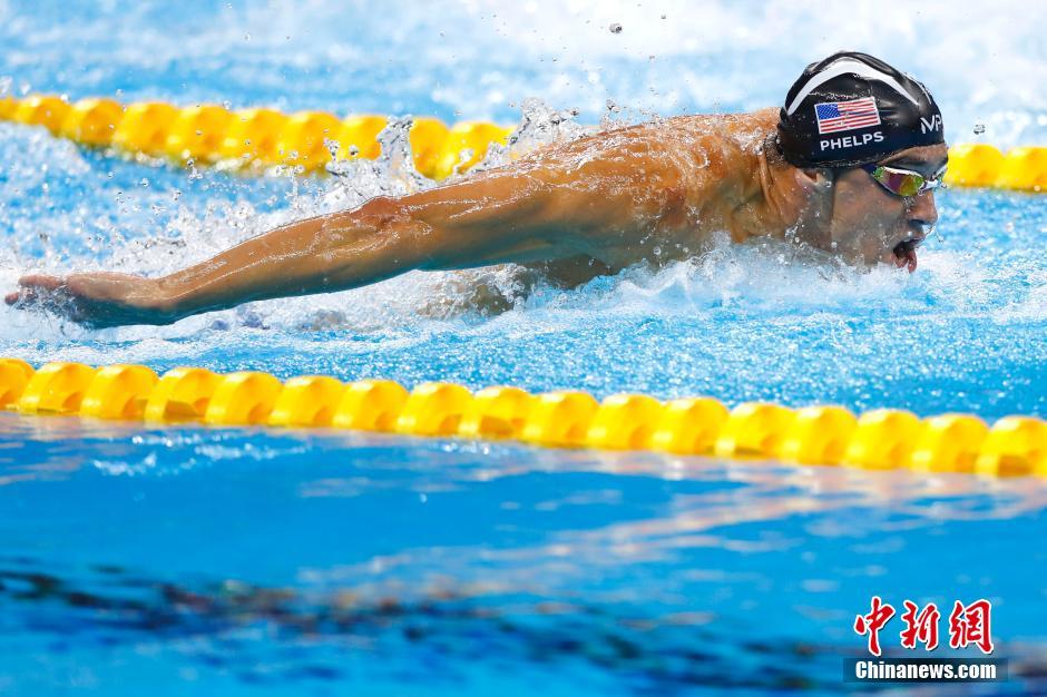 8月13日,在里约奥运会游泳赛场最后一天的比赛中,菲尔普斯领衔的美国队在男子4X100米混合泳接力决赛中,获得冠军,这块金牌成为菲尔普斯的奥运会第23金,完美收官。中国队因为犯规被取消成绩。图为菲尔普斯在比赛中。中新网记者富田 摄