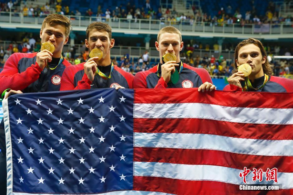 8月13日,在里约奥运会游泳赛场最后一天的比赛中,菲尔普斯领衔的美国队在男子4X100米混合泳接力决赛中,获得冠军,这块金牌成为菲尔普斯的奥运会第23金,完美收官。中国队因为犯规被取消成绩。图为美国队集体吻金牌庆祝。中新网记者富田 摄