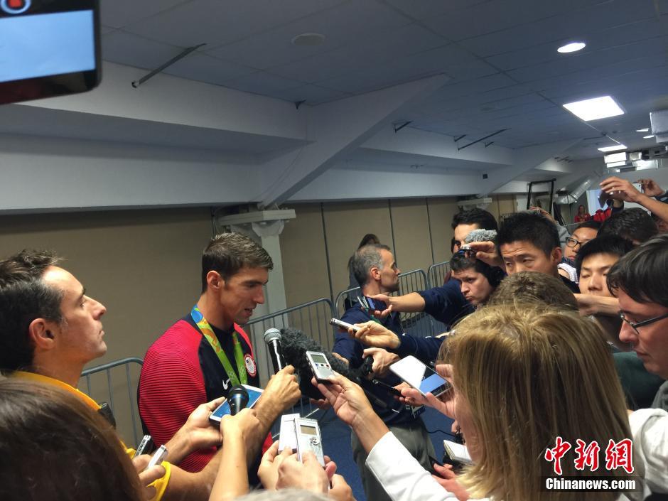 8月13日,在里约奥运会游泳赛场最后一天的比赛中,菲尔普斯领衔的美国队在男子4X100米混合泳接力决赛中,获得冠军,这块金牌成为菲尔普斯的奥运会第23金,完美收官。中国队因为犯规被取消成绩。图为菲尔普斯赛后接受采访。中新网记者王牧青 摄