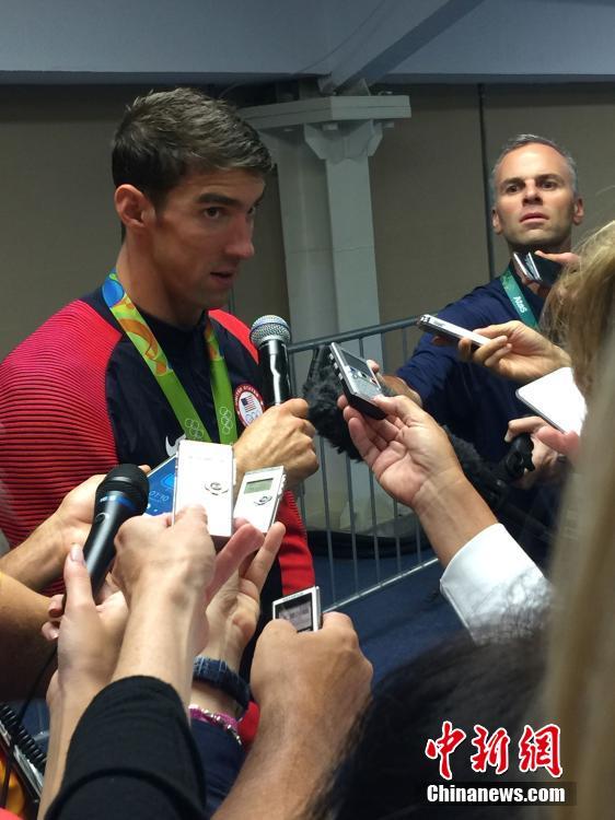 8月13日,在里约奥运会游泳赛场最后一天的比赛中,菲尔普斯领衔的美国队在男子4X100米混合泳接力决赛中,获得冠军,这块金牌成为菲尔普斯的奥运会第23金,完美收官。中国队因为犯规被取消成绩。图为菲尔普斯赛后接受采访。中新网记者王牧青 摄