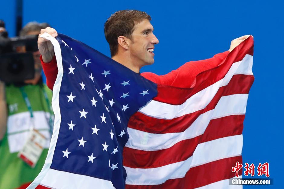 8月13日,在里约奥运会游泳赛场最后一天的比赛中,菲尔普斯领衔的美国队在男子4X100米混合泳接力决赛中,获得冠军,这块金牌成为菲尔普斯的奥运会第23金,完美收官。中国队因为犯规被取消成绩。图为菲尔普斯展国旗庆祝再次夺冠。中新网记者富田 摄