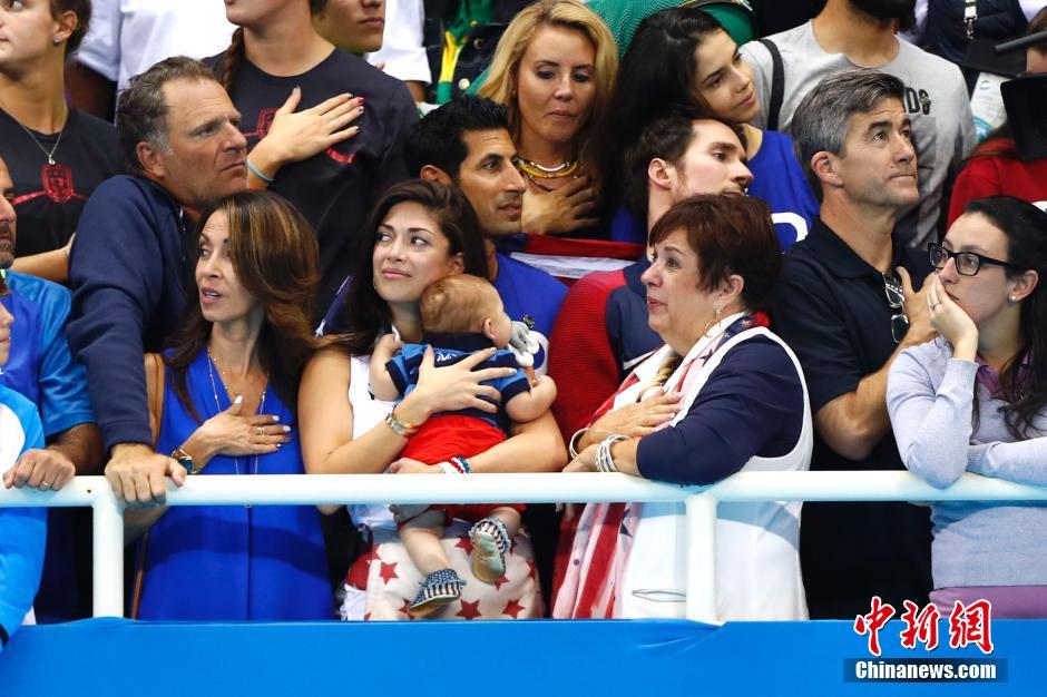 8月13日,在里约奥运会游泳赛场最后一天的比赛中,菲尔普斯领衔的美国队在男子4X100米混合泳接力决赛中,获得冠军,这块金牌成为菲尔普斯的奥运会第23金,完美收官。中国队因为犯规被取消成绩。图为菲尔普斯家属在看台观战。中新网记者富田 摄