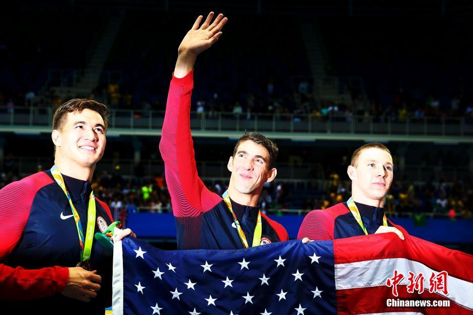 8月13日,在里约奥运会游泳赛场最后一天的比赛中,菲尔普斯领衔的美国队在男子4X100米混合泳接力决赛中,获得冠军,这块金牌成为菲尔普斯的奥运会第23金,完美收官。中国队因为犯规被取消成绩。图为菲尔普斯夺冠后向观众挥手致意。中新网记者富田 摄