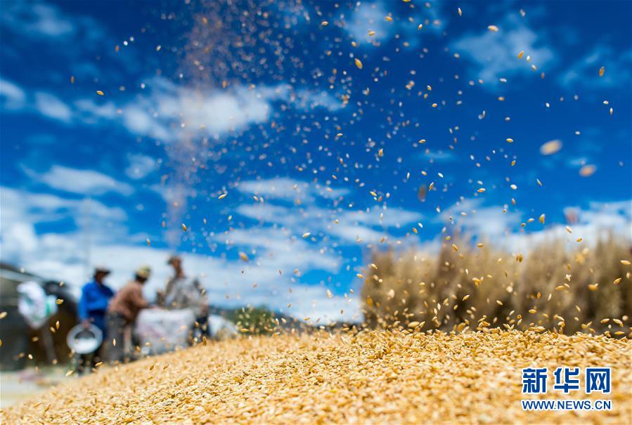近期,西藏多地农田进入忙碌的收割阶段,在拉萨河谷、雅鲁藏布江两岸,到处是一派丰收的景象。 新华社记者 普布扎西 摄