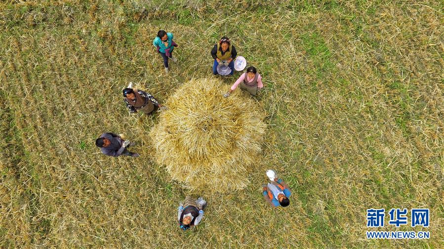近期,西藏多地农田进入忙碌的收割阶段,在拉萨河谷、雅鲁藏布江两岸,到处是一派丰收的景象。 新华社记者 普布扎西 摄