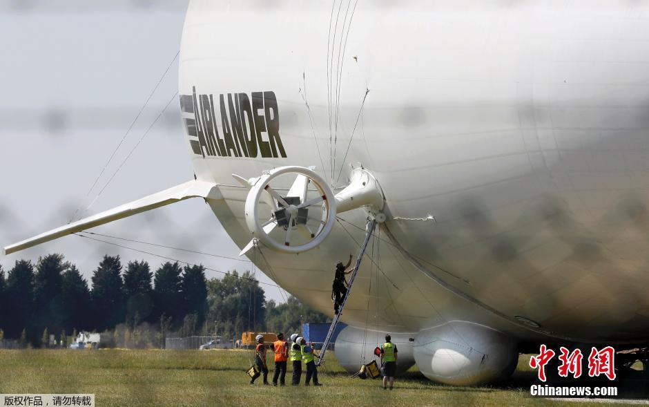 当地时间2016年8月17日,英国卡汀顿,全球最大的飞行器Airlander 10“天空登陆者”在经过数月准备之后终于在英国领空成功进行了首次试飞,并最终在北伦敦卡汀顿机场降落。图为起飞前的最后检查。