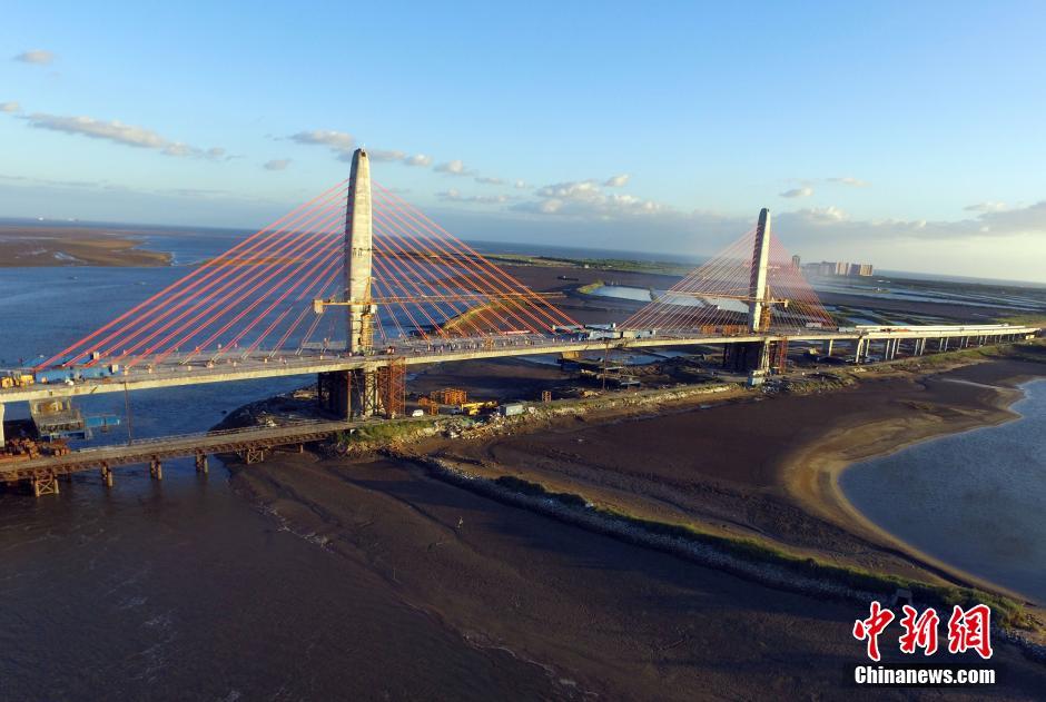 8月26日,威海南海新区香水河大桥主桥中跨合龙段顺利完成混凝土浇筑,标志着这座威海市第二大桥全桥贯通。该大桥路线全长1626米,是交通运输部滨海公路示范工程。在建设过程中,威海市首次启用海水造浆技术,解决淡水供应困难等问题。大桥建成后,威海南海新区滨海路将实现全线贯通,把该区东部临港产业区、中部综合商务区、西部旅游度假区连成一体。中新社记者 刘昌勇 摄