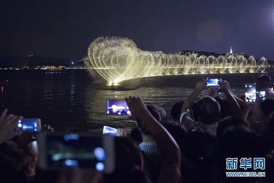 8月24日,游客在西湖边欣赏西湖音乐喷泉。 新华社记者 鞠焕宗摄