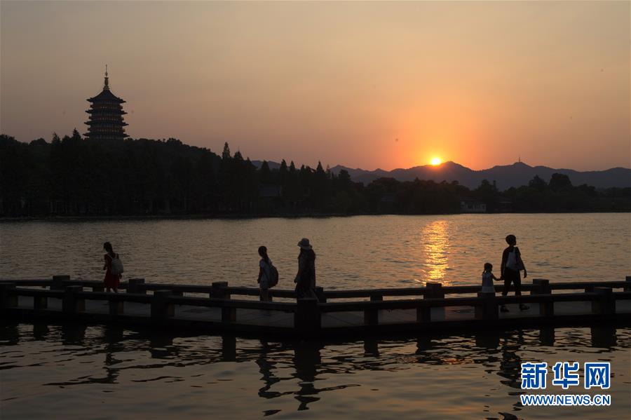 8月29日,游客在西湖边欣赏“雷峰夕照”景观。 新华社记者鞠焕宗 摄