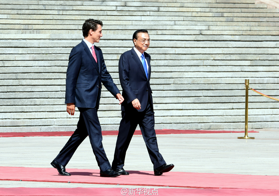 新华网北京8月31日电李克强总理31日在人民大会堂东门外广场举行仪式,欢迎来华正式访问并出席G20杭州峰会的加拿大总理特鲁多。会谈中,双方决定建立中加总理年度对话机制,一致同意本着相互尊重、平等相待的精神,抓住机遇,深挖潜力,开创中加关系和各领域务实合作的新时代。