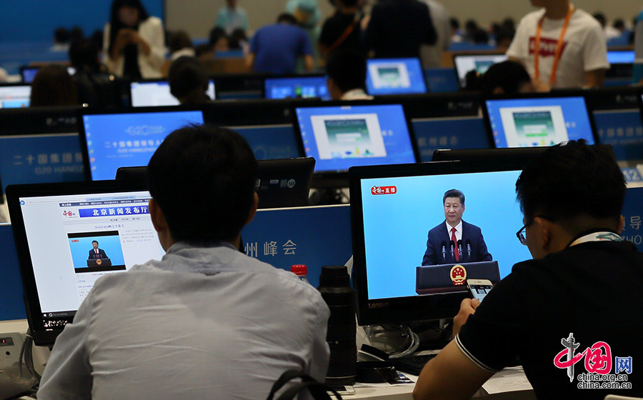 中国网讯 9月3日,2016年二十国集团工商峰会(简称B20峰会)开幕式在中国杭州举行,中国国家主席习近平出席开幕式并发表主旨演讲。在G20新闻中心,中外记者聚焦开幕式,并做好了会前及会议报道的准备。