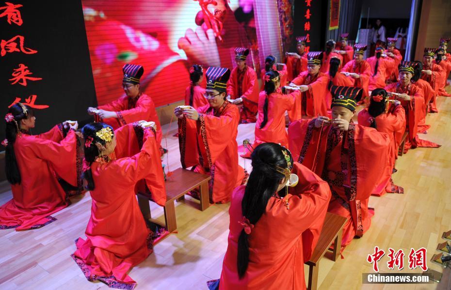 9月10日教师节,为倡导绿色婚典,弘扬中国传统文化,河北石家庄石门实验学校为12对新人举办了校园汉服集体婚礼,每对中至少有一位是该校老师。中新社记者 翟羽佳 摄