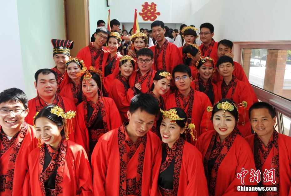 9月10日教师节,为倡导绿色婚典,弘扬中国传统文化,河北石家庄石门实验学校为12对新人举办了校园汉服集体婚礼,每对中至少有一位是该校老师。中新社记者 翟羽佳 摄