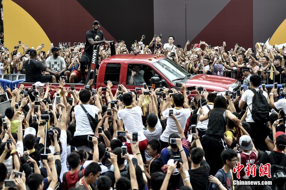 9月10日,詹姆斯在车上与球迷互动。当日,2015-2016年度NBA总冠军球员勒布朗·詹姆斯现身广州天河体育中心,吸引数千名球迷前来一睹球星风采。中新社记者 陈骥旻 摄