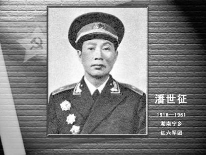 【人物简介】潘世征,1916年生,湖南宁乡县人,原名潘是真。1930年参加中国工农红军,历任团、旅、师、军和军区的卫生部部长、军事医学科学院副院长等职,1951年赴苏联学习,1955年被授予少将军衔,1956年获医学副博士学位。1961年7月,因病在青岛逝世。