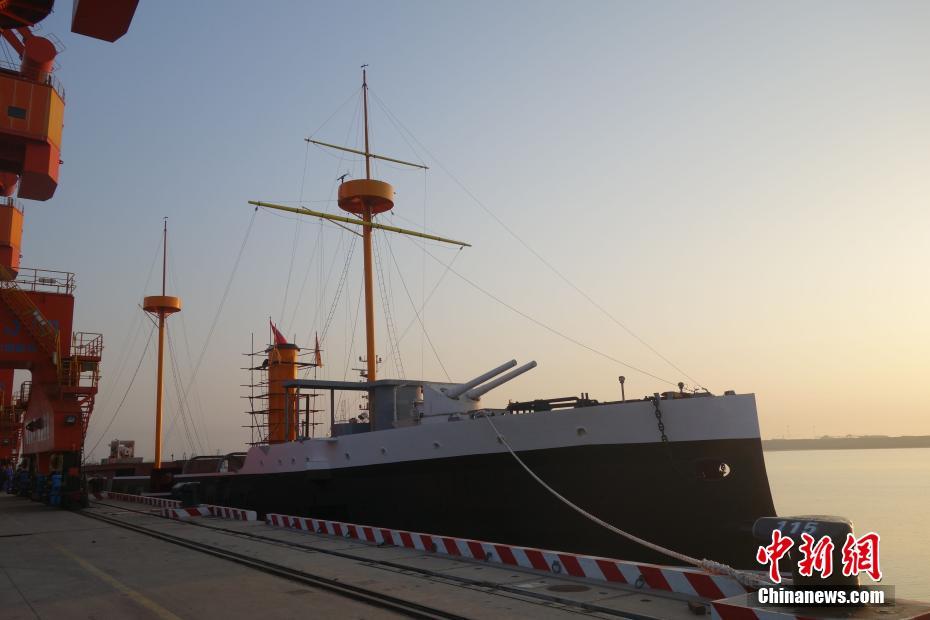 10月1日,甲午战舰“致远”纪念舰停泊在丹东港码头,等待前往浪头港。9月30日,历经两年的复制与建造后,“致远”纪念舰正式下水,停泊在浪头港后,民众可以看到纪念舰的整体。中新社记者张颖 摄
