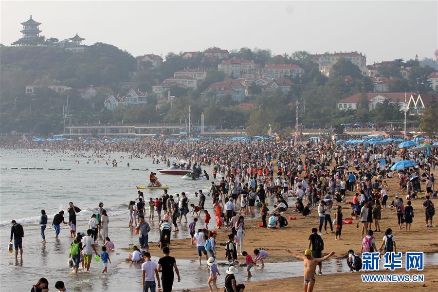 10月4日,游客在青岛第一海水浴场游玩。国庆长假第四天,各地景区持续迎来客流高峰。 新华社发 黄杰显 摄 图片来源:新华网