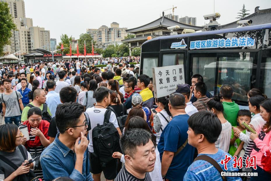2016年10月4日,陕西省西安市,“十一”国庆小长假第四天,陕西历史博物馆游客省爆棚,从早上六点多,许多游客就排起长队,拿身份证换取免费门票。人山人海的客流,早早就超出了馆内游客接待能力,致使限流进入参观,下午15点左右,工作人员举出“今日门票发售完毕”的牌子,提醒游客结束排队。中新社发 杨静龙 摄 图片来源:CNSPHOTO