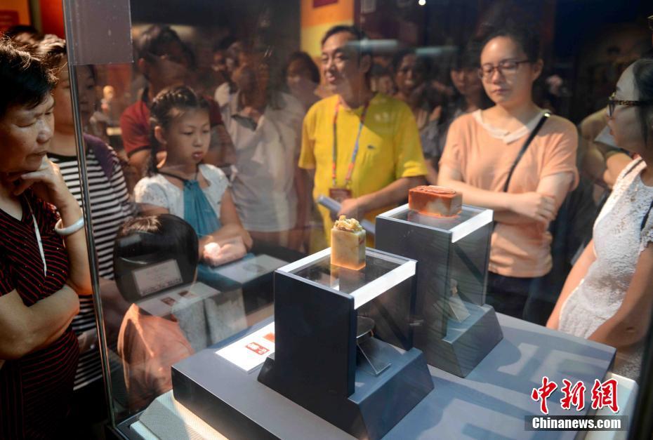 10月4日,正在福建博物院举办的寿山石回故乡展,吸引众多民众前来近距离观赏深藏故宫里的寿山石国宝。寿山石是中国四大印章石之首,被誉为“国石”。此次福建博物院从故宫博物院引进149件清代宫廷御用的寿山石精品,涉及印章印料、宗教人物和陈设摆件,一半以上展品是首次对外展览,其中最吸引眼球的是10位帝后所用宝玺。同步展出的还有100多件现当代寿山石雕精品,包括林清卿、郭功森、冯久和、林发述、林寿煁、叶敬攸、周宝庭、王祖光、林飞、陈礼忠等大师的代表作,还有网选的当代新锐雕刻艺人的作品。刘可耕 摄