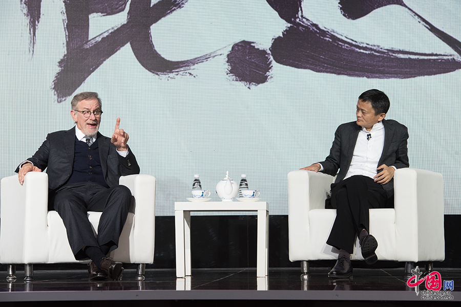 阿里巴巴董事局主席马云与好莱坞电影大师史蒂文·斯皮尔伯格跨界对话。 中国网记者 张若梦 摄