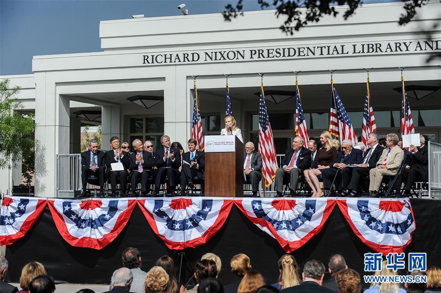 10月14日,在美国加利福尼亚州约巴林达市,美国前总统尼克松之女特里西娅·尼克松·考克斯(中)在理查德·尼克松总统图书馆升级改造揭幕仪式上致辞,中国驻美国大使崔天凯(前排左三)、美国前国务卿基辛格(前排右三)出席。新华社记者张超群摄