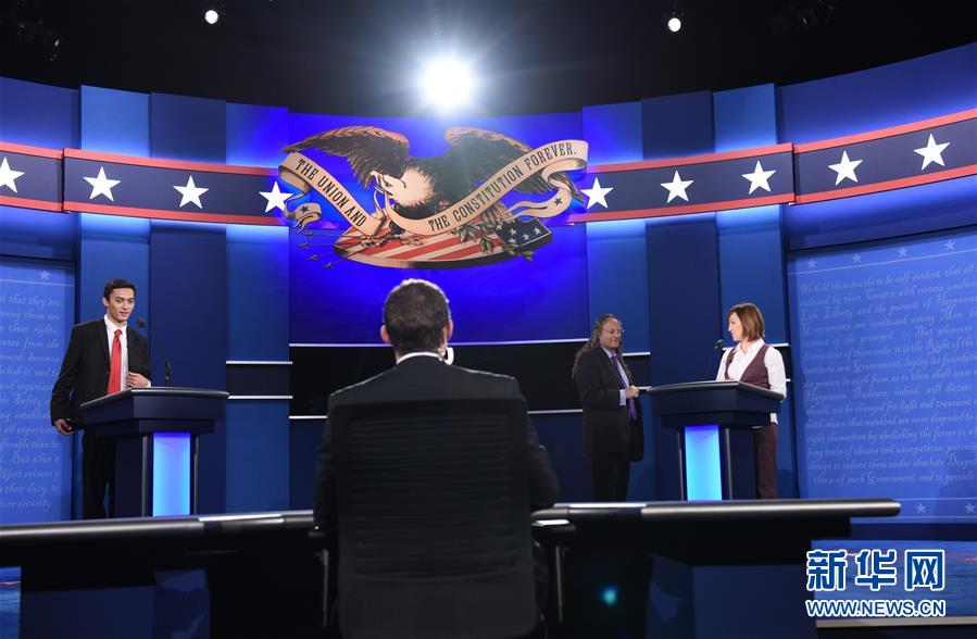 10月19日,在美国拉斯维加斯的内华达大学拉斯维加斯分校,工作人员彩排辩论直播。
