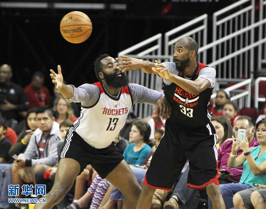 10月23日,火箭队球员哈登(左)在球迷日公开训练中防守队友布鲁尔。