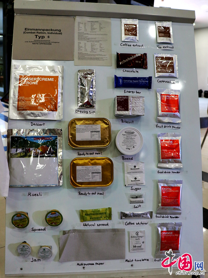 德国救援队员军用食品包里食品配备。 中国网裴希婷 摄影