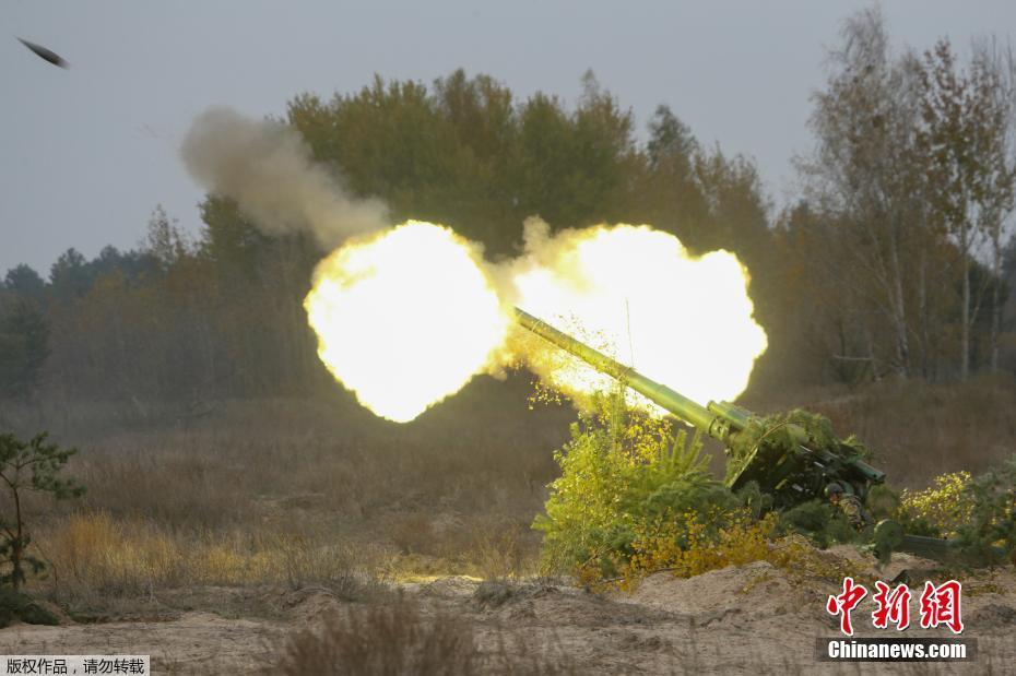 当地时间10月21日,乌克兰军队在首都基辅附近举行军事演习,各式榴弹炮纷纷上阵,现场炮火猛烈硝烟滚滚。图为152mm榴弹炮发射瞬间。