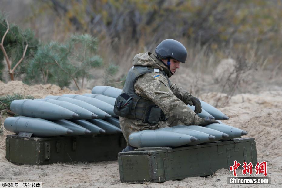 当地时间10月21日,乌克兰军队在首都基辅附近举行军事演习,各式榴弹炮纷纷上阵,现场炮火猛烈硝烟滚滚。图为乌克兰炮兵调整炮弹。