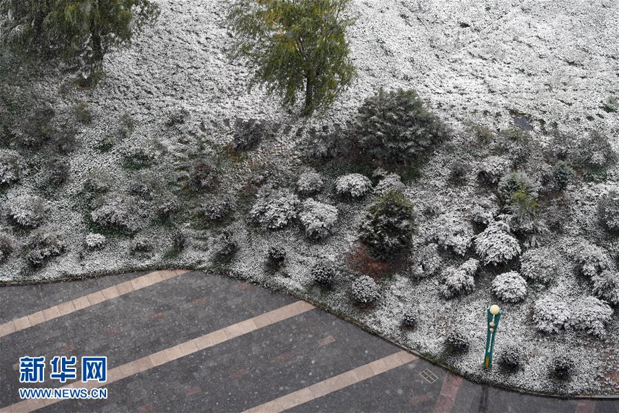 10月27日,在兰州市榆中县,雪花飘落在道路旁的绿化带上。新华社记者 范培珅 摄