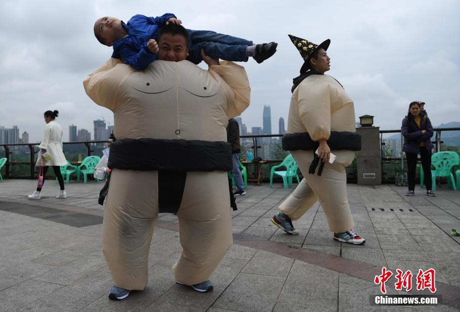 一市民身着相扑服饰扛起一名小孩。陈超 摄