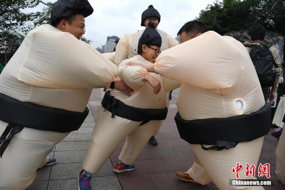 重庆青年上班族玩趣味“相扑”大战释压