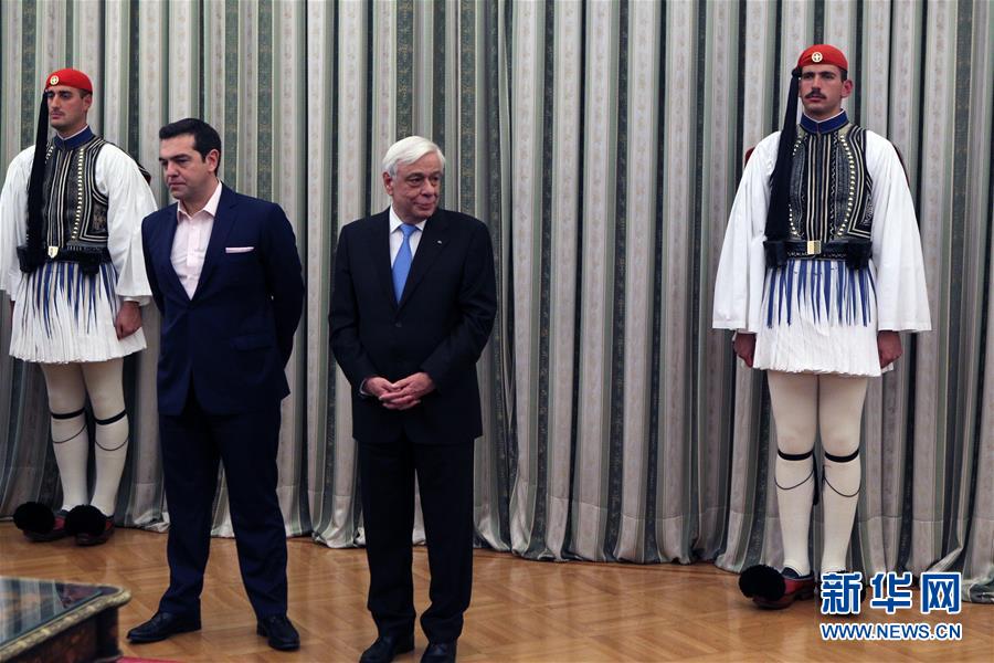 11月5日,在位于希腊雅典的总统府,希腊总统帕夫洛普洛斯(右二)、总理齐普拉斯(左二)出席新内阁宣誓就职仪式。经过改组的希腊内阁5日宣誓就职。希腊总理齐普拉斯及多名内阁成员表示,新内阁将把工作重点放在恢复经济增长及改善人民生活方面。新华社发(马里奥斯·罗洛斯摄)